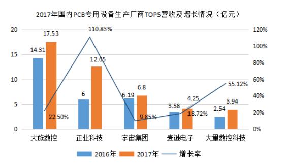 國內PCB專用設備排名第一的是大族數控,是由深圳市大族激光科技股份有限公司組建的全資子公司,開發和生產HANS系列PCB激光設備、PCB數控鉆銑機等印刷電路板行業的專用設備,適用于印刷電路板的精密鉆孔和異形槽、孔、邊 框的銑削加工。2017年營收高達17.53億元,同比增加22.50%;正業科技排名第二,2017年營收為12.65億元,同比增長高達110.83%。整體來說,PCB專用設備/儀器代表公司營收情況較好,市場進入壁壘較高,競爭相對較小。