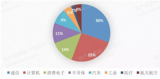 PCB廣泛應(yīng)用于計算機、通信、消費電子、工控醫(yī)療、軍事、半導(dǎo)體和汽車等行業(yè),幾乎涉及所有電子信息產(chǎn)品。其中,計算機、通信和消費電子是三大主要應(yīng)用領(lǐng)域,占據(jù)了PCB行業(yè)產(chǎn)值的70%左右。