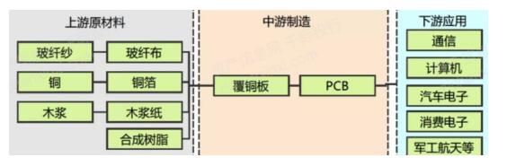 PCB上游原材料包括銅箔、樹脂、玻纖布、木漿、油墨、銅球等,其中銅箔、樹脂和玻纖布是三大主要原材料;中游制造是指通過蝕刻等工藝將覆銅板制作成PCB板的過程;下游則是通信、計算機等各類PCB的應(yīng)用。