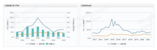 從行業(yè)估值和歷史比較來看,電路板的估值普遍比A股高,總體趨勢呈現(xiàn)估值先升高后降低的狀態(tài)。單季度營收同比行業(yè)歷史比較與全部A股趨勢較為一致。