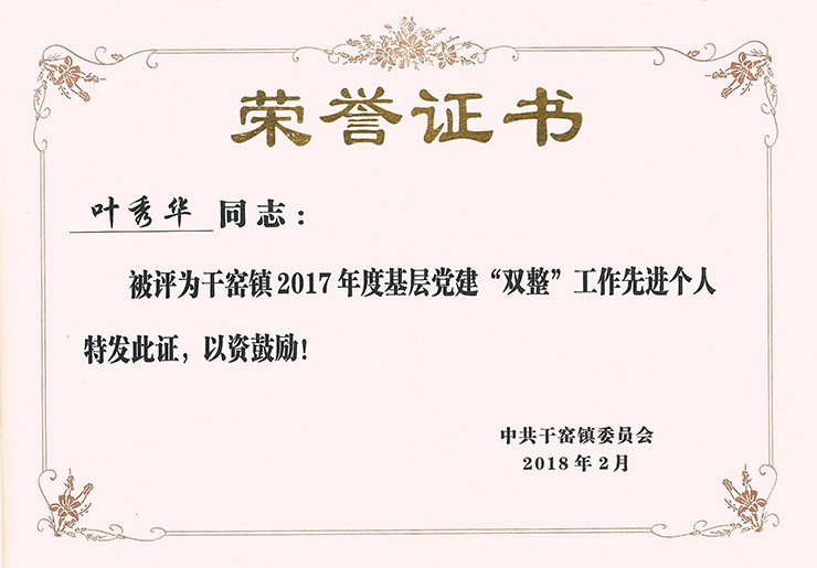 熱烈祝賀公司葉秀華同志被中共干窯鎮委員會授予2017年度基層黨建“雙整”工作先進個人光榮稱號