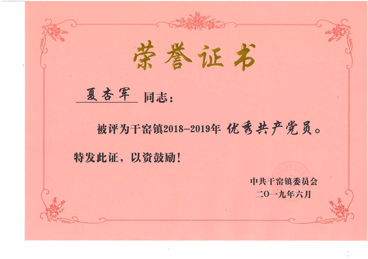 熱烈祝賀公司夏杏軍同志被中共干窯鎮委員會授予2018-2019年度“優秀共產黨員“光榮稱號
