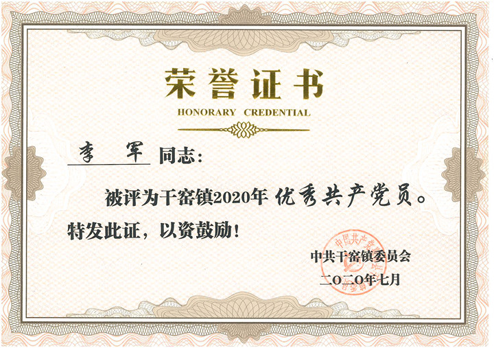 熱烈祝賀公司李軍同志被中共干窯鎮委員會授予2020年度“優秀共產黨員“光榮稱號